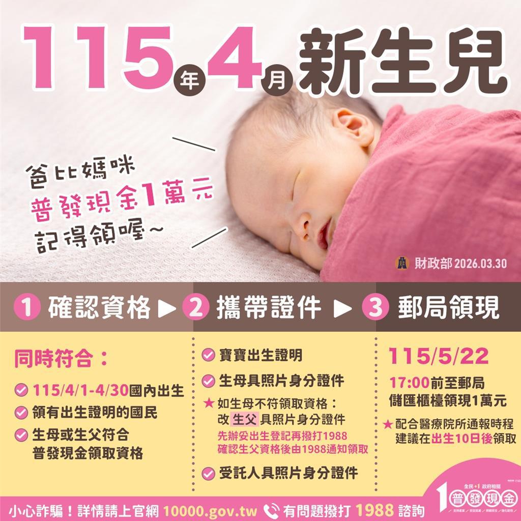 普發現金1萬元領取期限將於4月30日截止 ,財政部指出,凡是今年4月1日至30日於國內誕生且取得出生證明的嬰兒,只要生母或生父其中一方具備請領資格,家長務必把握在5月22日截止前完成領款手續。