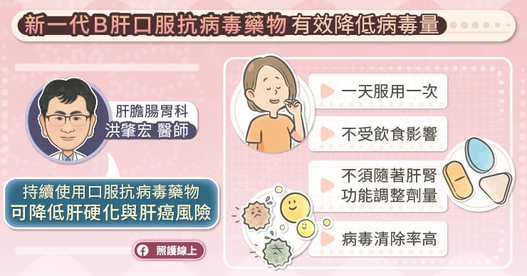 長期發炎的肝臟會漸漸進展為肝硬化,患者可能出現腹水、黃疸、凝血功能障礙、食道靜脈瘤出血、肝昏迷等狀況。過去B型肝炎的治療是使用干擾素,採用皮下注射,副作用較多,效果也不甚理想。洪肇宏表示,目前大多使用B型肝炎口服抗病毒藥物,透過抑制病毒複製,有效降低血中的病毒量。新一代B型肝炎抗病毒藥物採用口服,一天一顆,且不會受到飲食影響,可於飯前或飯後使用。此外,新一代B型肝炎抗病毒藥物較不受肝、腎功能影響,不須隨肝、腎功能調整劑量,便利性高。相較於干擾素類藥物,口服抗病毒藥的副作用較小。