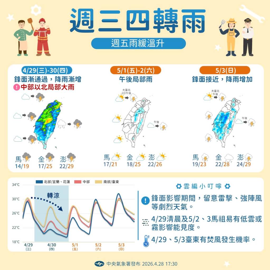 中央氣象署預報員張承傳向媒體表示,今天晚上起水氣減少,晚間到明天清晨,降雨較為局部,時間也會更短暫,明天白天起到5月3日白天天氣穩定,各地多雲到晴為主。