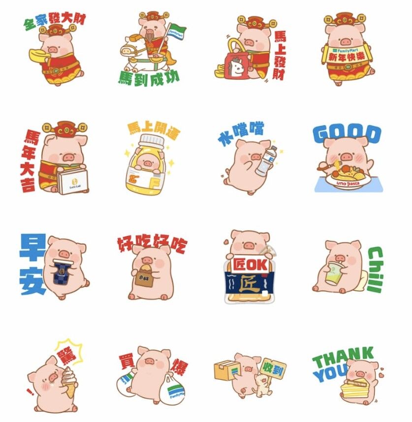 零售通路業者也不遑多讓,全聯福利中心推出「福利熊家族_熊好用」日常篇貼圖,全家便利商店則與人氣角色「罐頭豬LuLu」合作,推出「全家都馬可以」主題貼圖。兩者皆只要將官方帳號加為好友,即可免費下載,前者使用期限為180天,後者則為90天。