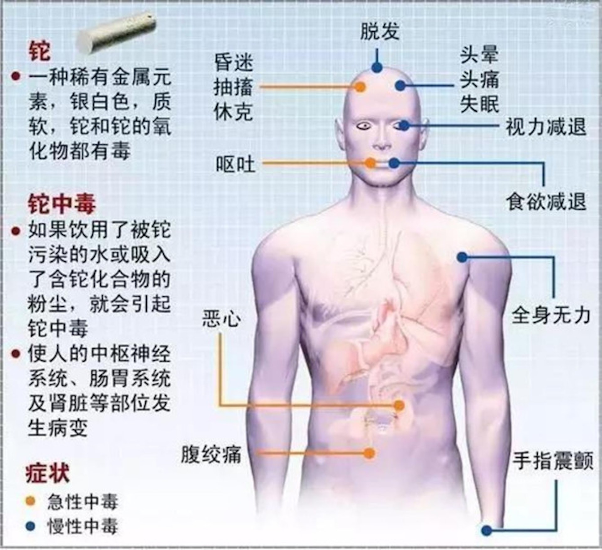 鉈和鉈的氧化物都有毒,能使人的中樞神經系統、腸胃系統及腎臟等部位發生病變。人如果飲用了被鉈污染的水,或吸入了含鉈化合物的粉塵,就會引起鉈中毒。