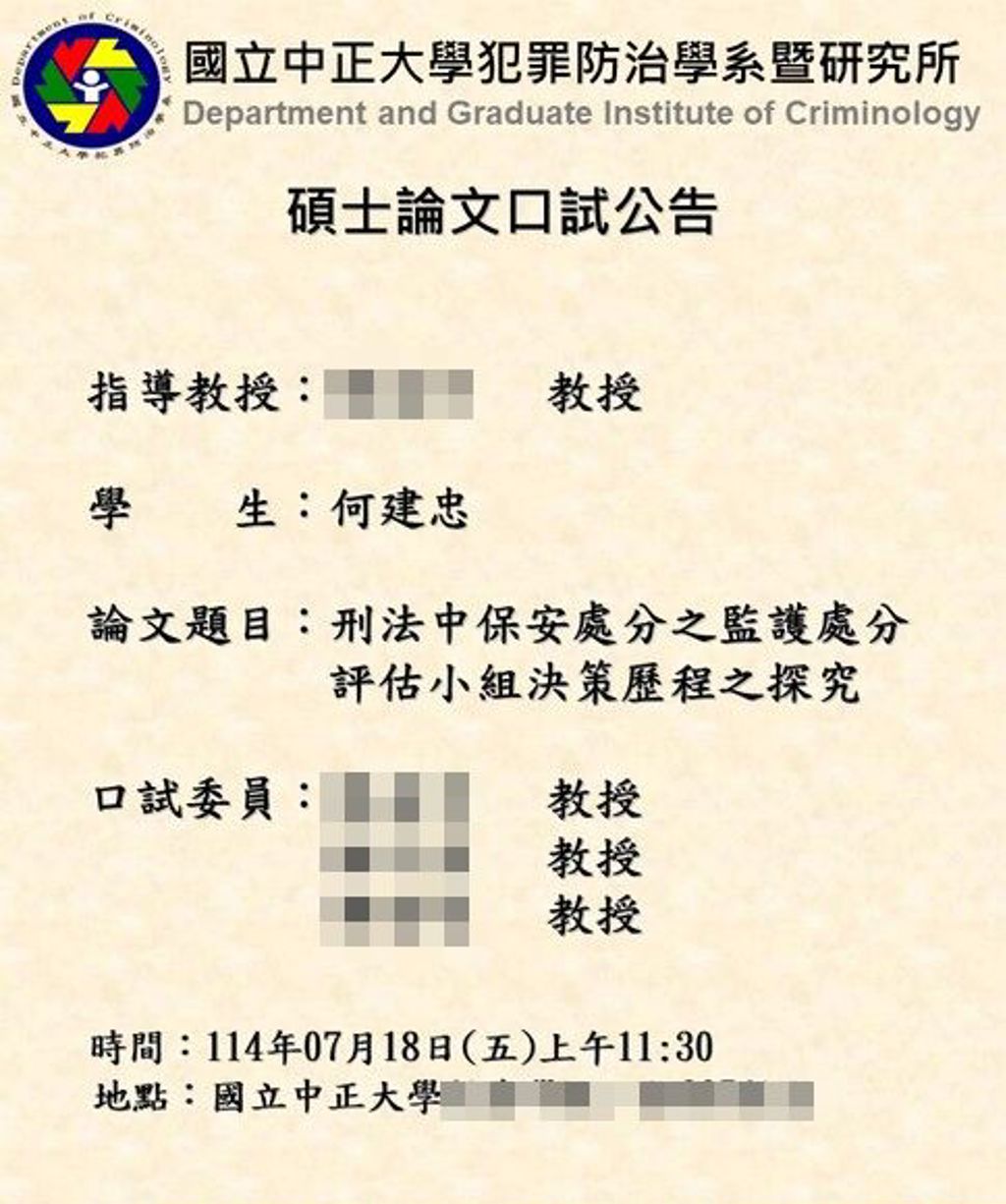 更令人震驚的是,何男在犯案後的7月18日,依然如常前往嘉義中正大學參加碩士論文口試,並以「刑法中保安處分之監護處分評估小組決策歷程之探究」為題進行論文發表,與其罪行形成強烈對比。調查顯示,何男在案發後不斷否認指控,但其名下車輛的監視器畫面顯示其進出旅館的情況,無法推翻證據。