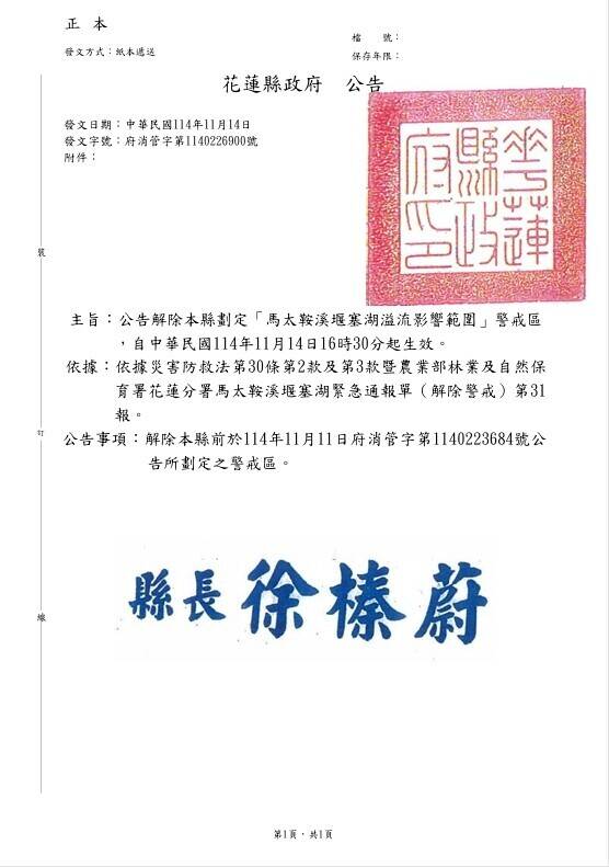 儘管紅色警戒已解除,當地政府仍呼籲居民避免靠近河川活動,以確保安全。花蓮縣政府於下午4點半公告解除應變中心一級開設,並正式宣布解除「馬太鞍溪堰塞湖溢流影響範圍」的警戒區。