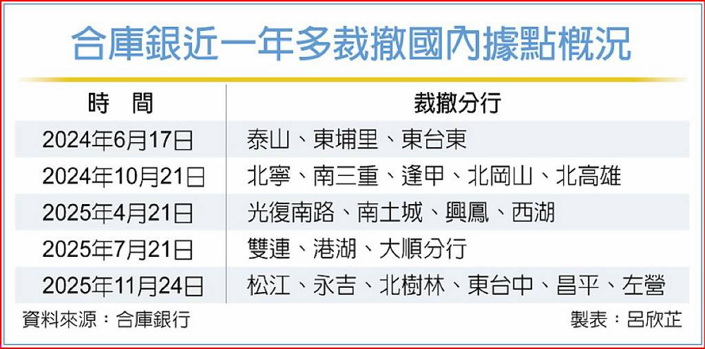 為因應數位化浪潮及客戶臨櫃交易需求減少,合庫銀行自2024年6月啟動分行整併作業,迄今已完成裁撤北中南共15家分行,接下來預定於2025年11月24日再裁撤松江等6家分行,合計一年多來共裁撤21家分行。