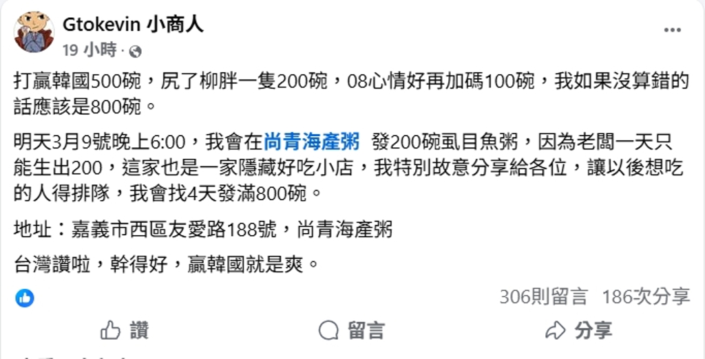 熱愛棒球的網紅小商人於臉書發文慶祝這場勝利,他表示:「打贏韓國500碗,尻了柳胖一隻200碗,08心情好再加碼100碗,我如果沒算錯的話應該是800碗。」小商人進一步公布,將分四天完成所有虱目魚粥的發送活動,與民眾共享這份喜悅。