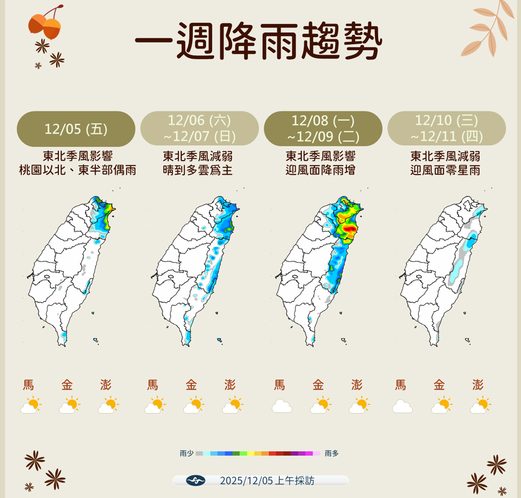 下周一、二東北季風增強,北台灣白天稍降溫,早晚偏涼,桃園以北、東半部及恆春半島降雨機率高,基隆北海岸、大台北山區、宜蘭有局部大雨可能,其他地區多雲到晴,低溫14-20度。