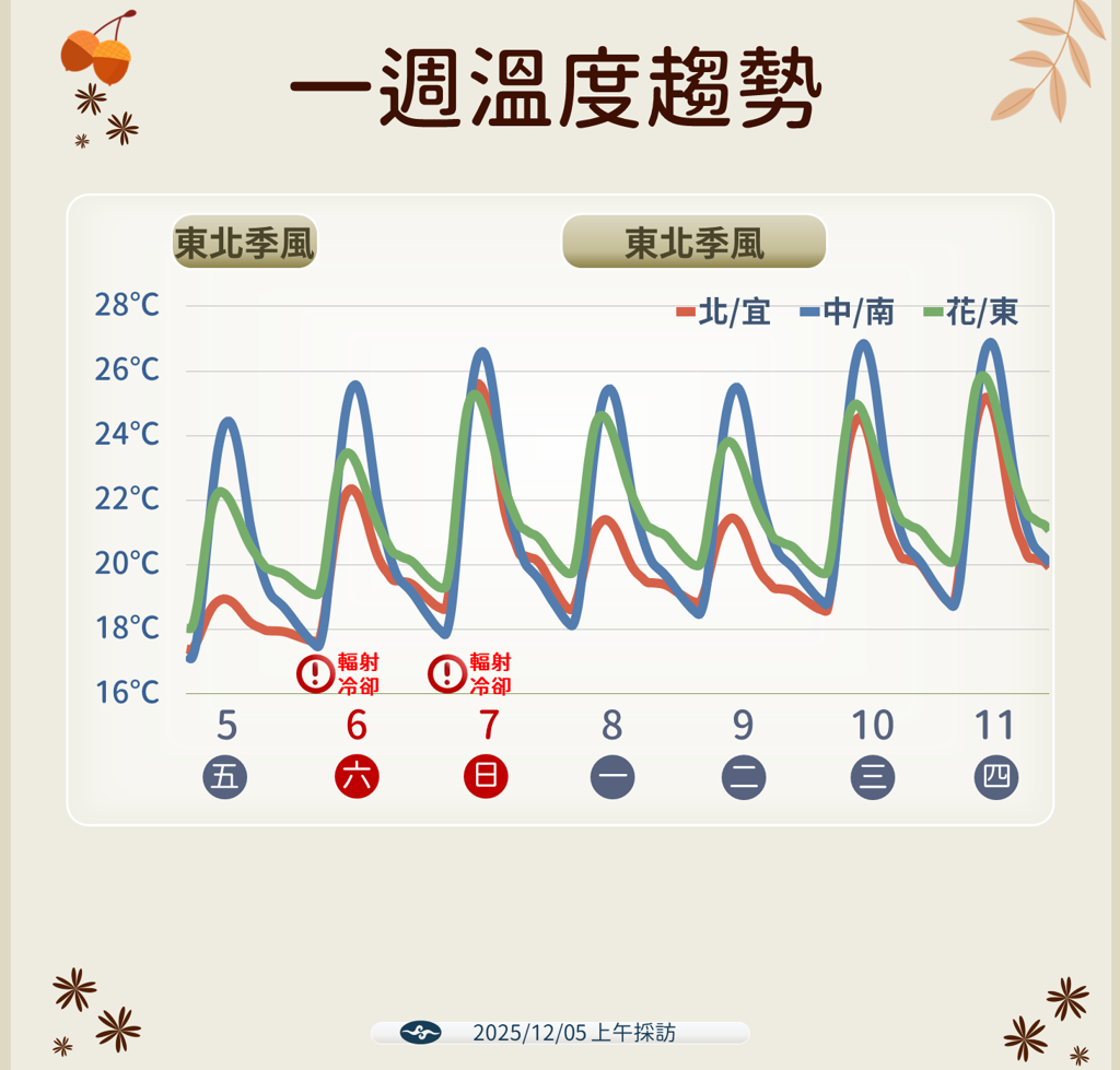台灣即將迎來兩波東北季風的影響,氣象署預測,明天(6日)各地早晚低溫將普遍在15至19度之間,而一些空曠地區及河谷地帶可能因輻射冷卻而出現更低的氣溫。氣象專家指出,接下來的冷空氣將在下周一(8日)開始增強,並在下周二(9日)影響台灣,北部地區的白天高溫會稍微下降。