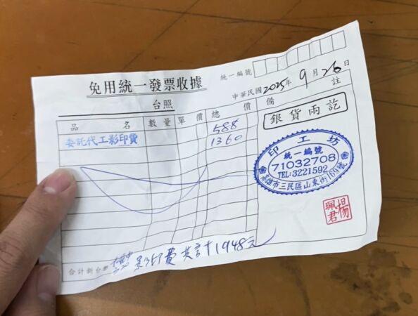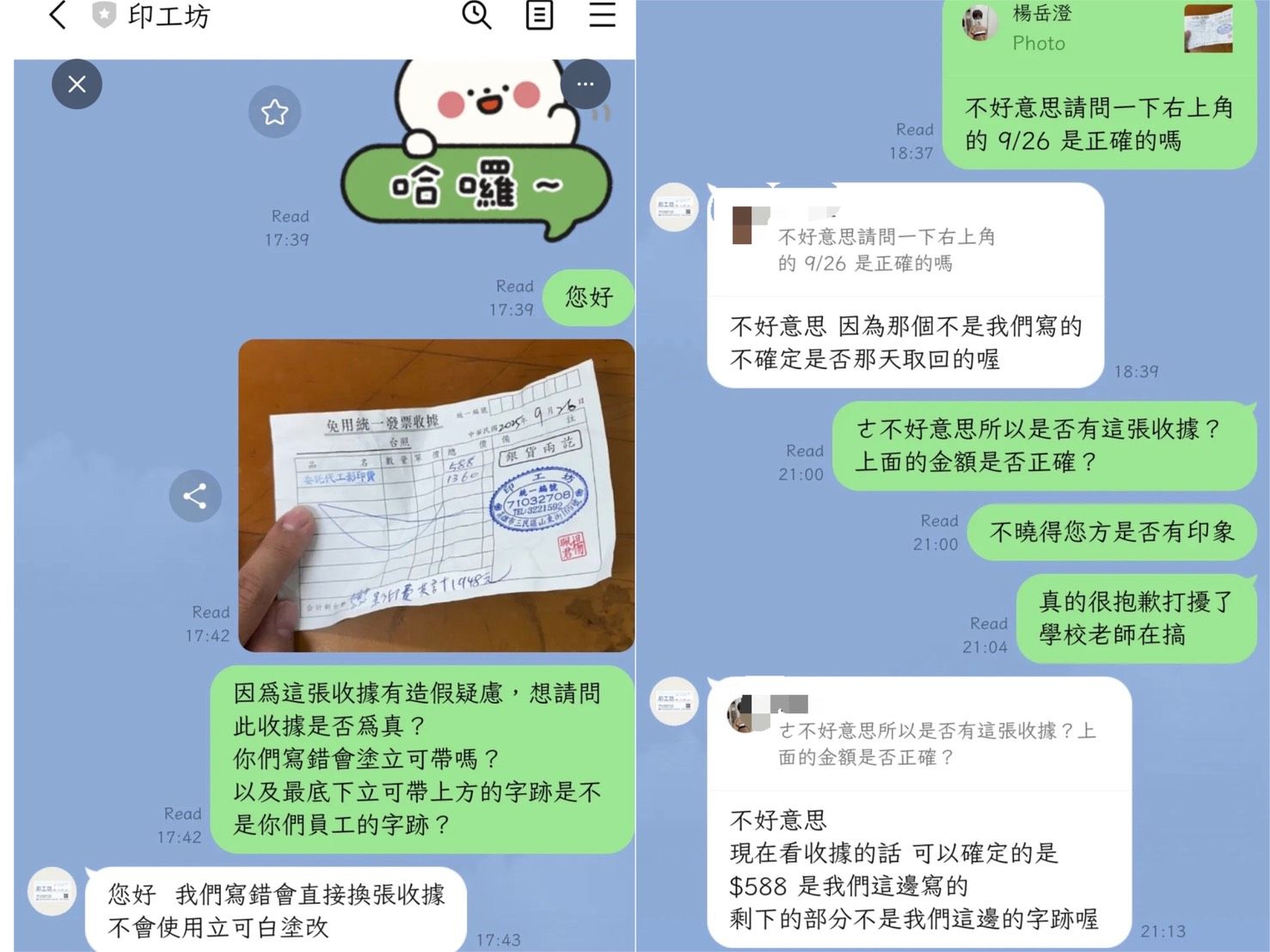 據學生在網路平台披露,該名國文教師提供的收據金額從588元被塗改為1948元,增加了1360元。學生質疑收據金額除以班級人數後無法整除,且經向影印店求證,店家表示若收據有誤會重新謄寫,不會使用立可白修改,同時也證實收據上的字跡並非店員所寫。