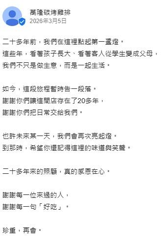 「萬隆碳烤雞排」的結束營業不僅僅是一家美食店的消失,對許多文山區居民而言,更像是告別了生活中的一部分。有顧客感性地寫道:「這是一間我從年輕吃到成為人父母的店。謝謝你們給了我無數小確幸時光,及每一次親切的服務。珍重。」
